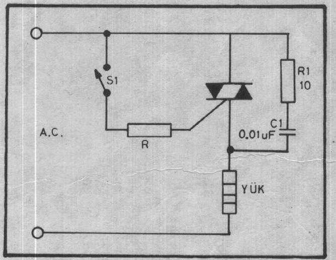 Yüksek güç gerektiren elektrikli aletlere kumanda etmek için büyük anahtarlara ihtiyaç vardır. Bunlar hem kaba, hem de büyük ve gürültülüdürler. Kullanılacak aletin gücüne uygun bir triyk seçmek ve şekildeki devreyi kullanmak suretiyle bunları minyatür anahtarlarla değiştirebilirsiniz. R drencini seçmek için 220, triyak için gerekli G (GATE) akımına bölümüdür. yani,