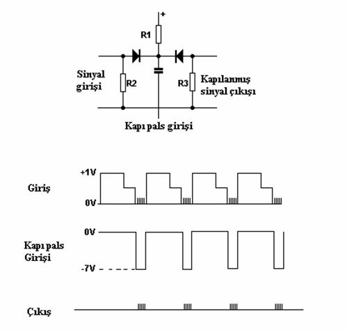 Elektronik bir kapı bir sinyalin bir kısmına açıktır diğer kalan kısmına kapalıdır. Bu koyuınların, gerçek bir kapı kullanarak keçilerin arasından ayrılmasına benzer. Devrede diyotların katodları anoduna göre daha pozitif olduğu için diyotlar ters polarma altındadır ve yalıtımdadırlar. Bu durumda devrenin çıkışı, girişinden yalıtılmış durumdadır.