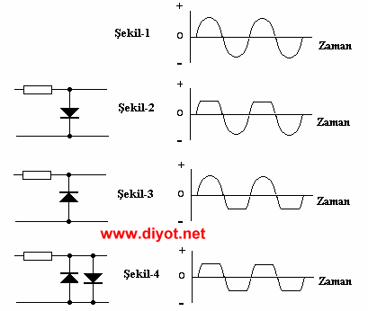 Şekil-1’de kırpıcı içindeki dalga şeklini göstermektedir. Şekil-2’de pozitif kırpıcının çıkış dalga şekli görünmektedir. Şekil-3’de ise negatif kırpıcının çıkışının dalga şekli gösterilmektedir. Şekil-4’de de her iki tepe sinyali kırpılır. Bu devre çıkış sinyal değeri 1.2V değerini aşamayan bir limitleyici .olarak bilinir.