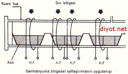 Aynı anda germanyum içerisinde ki yabancı maddeler de eriyerek çubuğun arka tarafına toplanır. Saflaştırma sonunda bu uç kesilerek alınır.Isıtıcı sistem, germanyumun erime derecesi olan 936°C ‘ye ayarlanıştır.